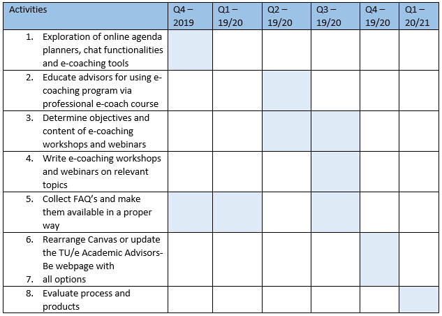 The academic advisors of AUBS will continue to incorporate the new online tools in their daily work processes when it is evaluated as successful, actively monitoring if the work processes are up to date. They will inform their professional peers in the ‘ketenoverleg’ of the academic advisors TU/e and will invite the peers to join using the work methods if successful. If this new way of study guidance works well, other faculties can also use it.