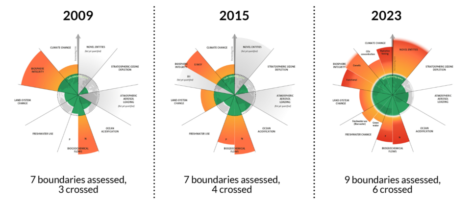 The evolution of the planetary boundaries framework. Source: Azote for Stockholm Resilience Centre, Stockholm University. Based on Richardson et al. 2023, Steffen et al. 2015, and Rockström et al. 2009)