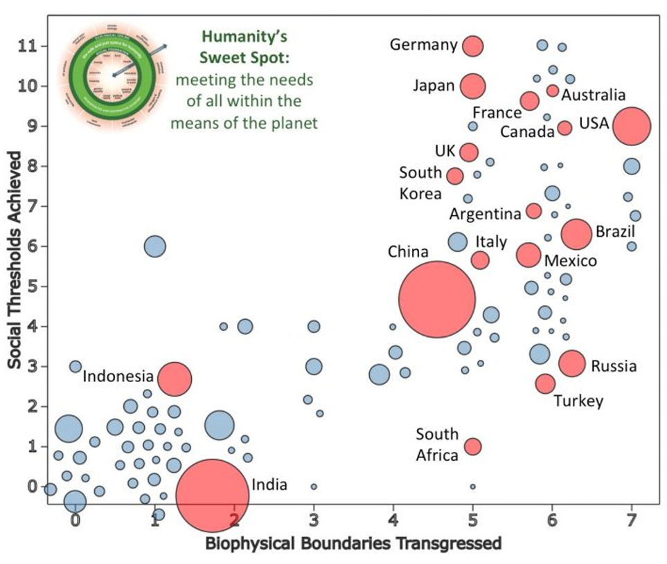 This graph serves as a prompt to reconsider how economies operate globally and nationally, aiming to balance social well-being with ecological sustainability.