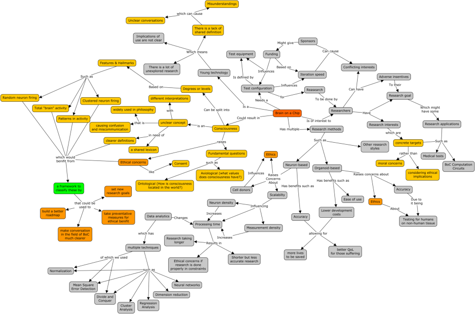 - Problem Space Analysis: During this activity, students submit a concept map that captures their current understanding of Brain-On-a-Chip technology, how data analytics can assist in B-O-C technology, and ethical considerations.