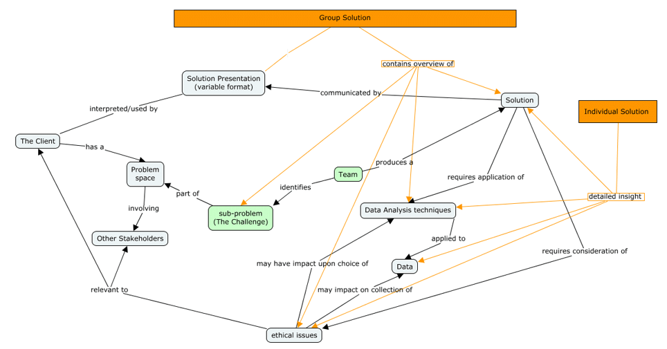 Student teams formulate their own sub-problem (Challenge) and develop a solution for it. As part of their solution, they explore data analysis techniques applied to the data provided by their client. The results of these techniques are included in their solution, which they present to their client. Another component of their solution involves addressing ethical issues during the process.