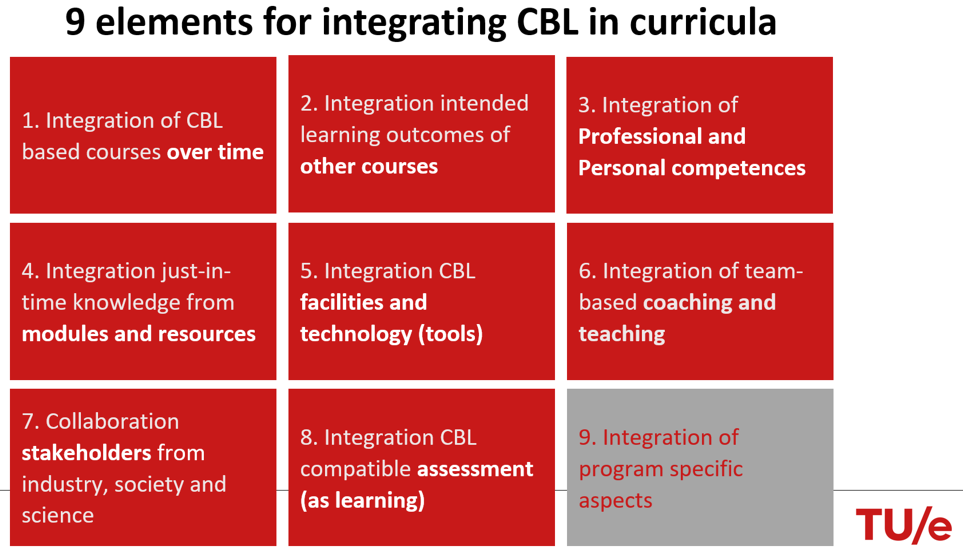 The Taskforce has identified 9 elements (now referred to as building blocks) that serve as guidelines for integrating CBL with other aspects of a curriculum. While the 10 dimensions help shape CBL on a course level, these 9 elements aid curriculum designers to integrate CBL into the curriculum. Below is an initial elaboration of each element.